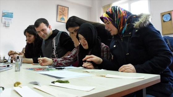Bilecik Engelsiz Yarınlar Derneği (BİEYDER) ortaklığında sürdürülen programda engelliler, temel derslerin molalarında kağıtlara işledikleri desenleri boyuyor.