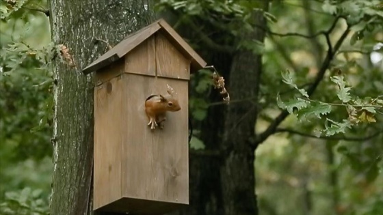 Kocaeli'ndeki Avrupa'nın en büyük doğal yaşam parkı Ormanya'da, kuşların yaşamlarının yakından incelenebilmesi amacıyla kurulan yuvalardan biri, doğum yapan kızıl sincaba yuva oldu.