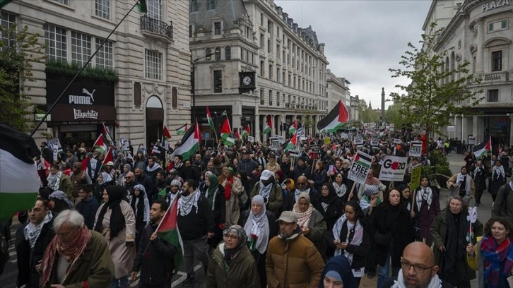 "Gazze'de soykırım var" ve "İsrail terör devleti" yazılı pankartlar taşıyarak "İsrail işgaline son ver", "Özgür Filistin" sloganları atan göstericiler, parlamentodan şehrin simge mekanlarından Hyde Park'a doğru yürüdü.