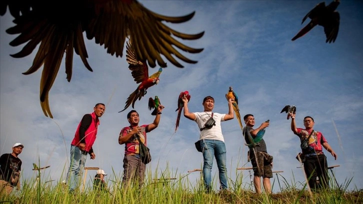 Güneydoğu Asya ülkesi Malezya'nın başkenti Kuala Lumpur'daki bir grup papağan tutkunu, Cheras bölgesindeki Damai Perdana tepesinde farklı türdeki papağanlarıyla 31 Mayıs Dünya Papağanlar Günü vesilesiyle "serbest uçuş" performansı sergiledi.