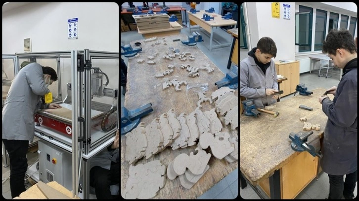 Öğrenciler, kendi üretimleri olan CNC router makinelerinde saatte 30 parçalık 10 oyuncak kiti hazırlıyor, oyuncak kitlerinin her biri baykuş, kaplan ve sincap figürlerinden oluşuyor.