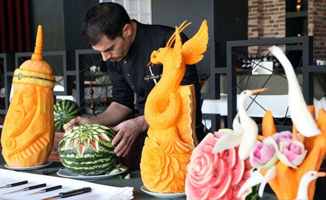DİYARBAKIR (AA) - Bestami Bodruk - Diyarbakır'da bir restoranda şef olarak çalışan Zübeyir Atlı, karpuz, kabak, turp, havuç, salatalık gibi birçok sebze ve meyveyi ince dokunuşlarla sanat eseri haline getiriyor.