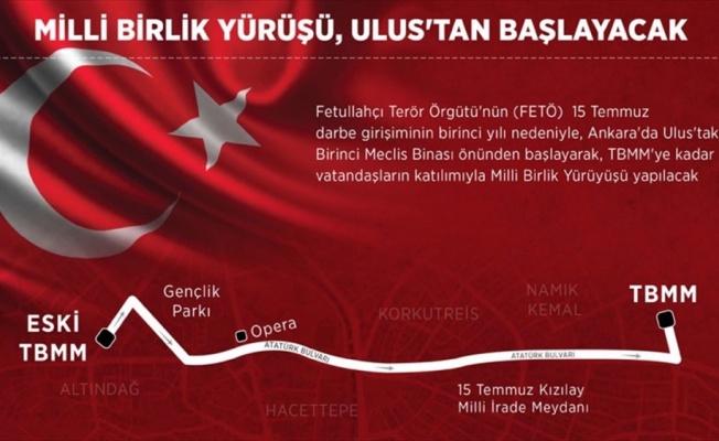 ANKARA (AA) - Fetullahçı Terör Örgütü'nün (FETÖ) 15 Temmuz darbe girişiminin birinci yılında Ankara'da düzenlenecek "Milli Birlik Yürüyüşü", Ulus'taki Birinci Meclis binası önünden başlayıp TBMM'de son bulacak.