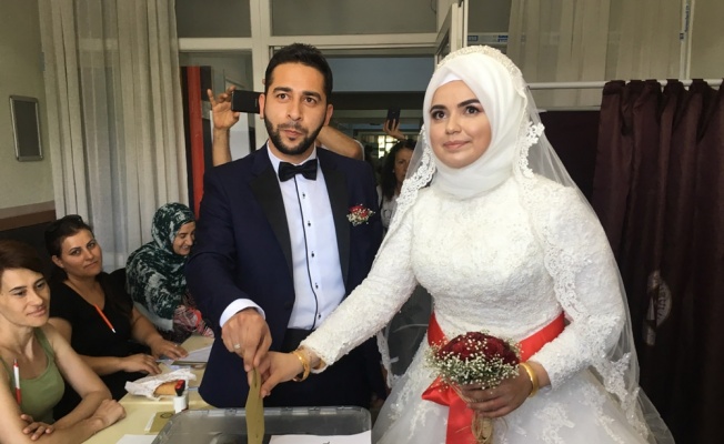 Gelin arabasının arkasına “ömrümün en özel seçimi” yazdıran çift, oylarını kullandıktan sonra düğünlerinin yapılacağı yere doğru yola çıktı.