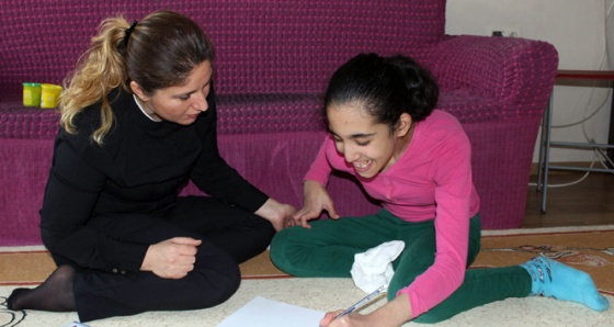 Özlem Bilgiç, Mervegül’ün çok zeki olduğunu ve çok iyi anlaştıklarını belirterek, “Mervegül yürüme ve konuşma problemi olan bir öğrencimiz. Haftanın 2 günü onun evine geliyorum. Her geldiğimde ilk önce Merve’nin kalem tutması biraz zor olduğu için kaslarını gevşetmek amacıyla biraz el, kol ve parmak hareketleri, ondan sonra oyun hamurlarıyla oynama hareketleri yapıyorum. Onun dışında Merve’yle bol bol kâğıt kesimi çalışmaları yapıyoruz. Boyama çalışmaları yapıyoruz.