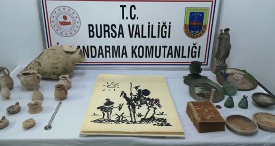 Edinilen bilgiye göre, İl Jandarma Komutanlığı ekipleri, tarihi eser kaçakçılarının ellerindeki ünlü ressam Picasso'ya ait olduğu değerlendirilen “Don Kişot” resimli tabloyu satmaya çalıştıkları esnada "Kafes" programının radarına yakalandı. Tarihi eser kaçakçılarını yakalamak için harekete geçen ekipler, alıcı kılığında irtibata geçerek satıcılarla bir araya geldi. Tarihi eser kaçakçılarıyla buluşan jandarma ekipleri G.G., İ.Ö., M.S.A., H.Y., M.A., S.S. ve G.Y. isimli şüpheli şahısları suçüstü yakaladı. Şahısları gözaltına alan ekipler, 1 adet ünlü ressam Picasso'ya ait olduğu değerlendirilen “Don Kişot” resimli tablo, 3 adet cam gözyaşı şişesi, 2 adet toprak gözyaşı şişesi, 5 adet yağdanlık, 4 adet toprak kase, 1 adet toprak küp, 2 adet cam obje, 2 adet toprak bardak, 1 adet toprak heykel, 1 adet toprak küp, 1 adet 30 cm çapında bayan ve erkek tablo, 1 adet 20 cm çapında metal resimli obje, 1 adet toprak sürahi, 2 adet gözyaşı şişesi kapağı, 1 adet gümüş madalyon, 1 adet madeni para, 1 adet yabancı menşeli kitap, 1 adet tepsili kadeh ele geçirdi. Yakalanan tarihi eser kaçakçıları sorgulanmak üzere karakola götürülürken, olayla ilgili soruşturma devam ediyor.