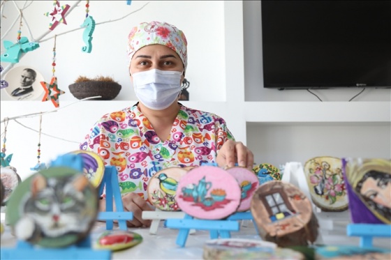 Hemşire Birsen Öztürk de hastanede mesai arası ve sonrası resim, ahşap ve taş boyama yaptıklarını dile getirerek, bundan inanılmaz keyif aldıklarını kaydetti.