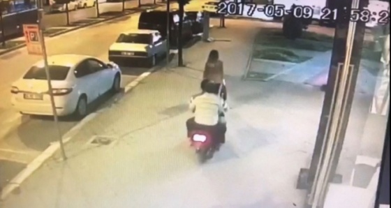 Güvenlik kamerası görüntülerinde motosikletle gelen iki kişi, E.İ. adlı kadına yaklaşıyor. Daha sonra motosikletteki bir kişi, kadının kolundaki çantasını çekerek almaya çalışıyor. Çantasını kaptırmak istemeyen kadın ise bir süre motosikletin peşinde sürükleniyor. Kadını metrelerce yerde sürükleyen iki kişi daha sonra çantayı alarak gözden kayboluyor.