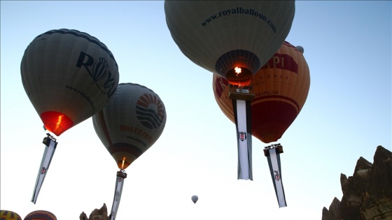 Sepetlerdeki yabancı turistlerle peş peşe gökyüzüne yükselen balonlar, 15 metre uzunluğundaki dev Beşiktaş bayrakları ile güzel görüntü oluşturdu.