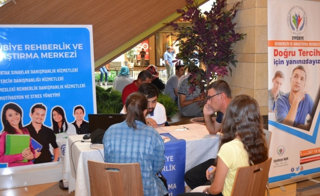 578 okulda 41 bin 614 öğrencinin sınava girdiği Şanlıurfa'da dün, Şanlıurfa Piazza AVM'nin ortak kullanım alanında açtığı stantta hizmet vermeye başlayan Eyyubiye Rehberlik ve Danışmanlık Merkezi, Şanlıurfalı tüm öğrencileri daha iyi bir gelecek için stantlarına bekliyor.