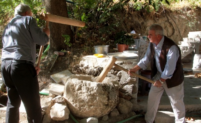 Helvayı evlerin avlusunda taştan oyulan gereçlerde hazırladıklarını belirten Dabakoğlu, tokmaklarla süren işlemin yaklaşık 3 saati bulduğunu aktardı.