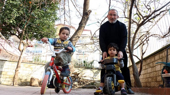 Suriyeli çocuklara bisiklet alan Mustafa Turan, torunlarından ayırmadığı Zeynel Abidin (2), Tacettin (3) ve Seyfettin Elmeşhur (6) ile evin bahçesinde oyunlar oynuyor.