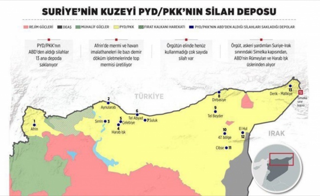 AA muhabirleri, açık kaynaklar ile PYD/PKK işgalindeki bölgede bulunan güvenilir yerel kaynaklardan elde ettikleri bilgilerle, Suriye'nin kuzeyinde terör örgütü tarafından oluşturulan silah depoları ve sevkiyat güzergahlarını belirledi. Buna göre, örgüt, nisan 2016'dan bu yana Suriye-Irak sınırındaki Simelka kapısından ve Haseke'deki kurduğu Rümeylan ve Halep'in doğusundaki Harab Işk üslerinden CENTCOM'un askeri yardımlarını alıyor. Örgüt, Irak Kürt Bölgesel Yönetimi (IKBY) kontrolündeki Simelka'dan giren ağır silahlar, mayına dayanıklı muharip zırhlı araçlar, yakıt ve askeri amaçla kullanılan prefabrik konteynırları depolara naklediyor. - Haseke'deki depolara giden iki rota Kara ve hava yoluyla Haseke’ye giren silah ve mühimmatlar iki rotadan terör örgütüne iletiliyor. Kara yoluyla gelen ağır silahlar, zırhlı araçlar ve yakıt tankerleri Fırat Nehri çevresindeki noktalara dağıtılıyor. Erbil’den hava yoluyla Rümeylan’daki üsse inen silahlar ise Haseke'deki 3 depoya; Dirbasiye, Tel Beyder ve Derik beldelerindeki depolara gönderiliyor. PYD/PKK kontrolündeki bölgelere kara yoluyla taşınan çeşitli silah, mühimmat ve araçlar da Haseke ve Kamışlı üzerinden, 6 numaralı otoyol ve Simelka’dan Halep’e uzanan M4 transit yolu aracılığı ile Harab Işk ve kuzeydoğusundaki Çelebiye'deki ana depolara ulaşıyor. Bu iki depo, aynı zamanda terör örgütü bölgesindeki en büyük depolar olarak biliniyor. Fırat Nehri kıyısındaki Sırrin ilçesine geçen sene inşa edilen ABD hava üssüne inen silah ve mühimmat da terör örgütü tarafından Harab Işk ve Çelebiye’deki depolara taşınıyor. Karadan Simelka'dan ve hava yoluyla Sırrin üzerinden iki ana noktaya iletilen silahlar ise Aynularab (Kobani), Tel Ebyad ve Suluk’ta bulunan farklı depolara dağıtılıyor. - Afrin'de mühimmat imalathaneleri ve depo Suriye-Türkiye sınırında Hatay'ın karşısına düşen Halep'in Afrin ilçesinde, terör örgütüne ait mermi ve havan imalathaneleri ile bazı demir döküm işletmelerinde top mermisi üretimi yapılıyor. Ülkenin doğusundaki Haseke bölgesinden çıkarak Beşşar Esed rejiminin kontrolündeki alandan geçen ticari tırlar, Afrin'deki imalathanelere ham madde taşıyor. Tırlar, mühimmat yapımına uygun demir, çelik ve ateşleyici maddeler getiriyor. Üretilen mühimmatın bir kısmı ilçede saklanırken bir bölümü örgütün diğer işgal alanlarına gönderiliyor. - Deyrizor silahlandırılıyor CENTCOM, DEAŞ ile mücadele gerekçesiyle Suriye-Irak sınırındaki Deyrizor bölgesinde de PYD/PKK’yı silahlandırıyor. Terör örgütü, silahları karayolu ile teslim alıyor. Irak-Suriye sınırındaki Simelka kapısından giren sevkiyat, Haseke’nin güneyindeki Şedadi ilçesinin El-Hul beldesi ile 47. Bölge adındaki iki ayrı yerleşimde depolanıyor. - ABD üsleri de silah deposu ABD güvenlik kurumları, askeri yardım sağlamanın yanı sıra yaklaşık 2 bin asker ile, 10 noktada terör örgütü ile aktif işbirliği içerisinde. Büyük çoğunluğu Irak sınırından Halep’e uzanan M4 otoyolu üzerindeki üsler de PYD/PKK’ya silah aktaran noktalar arasında. Rümeylan’daki havaüssü aracılığıyla Suriye’nin kuzeyinde konuşlanan CENTCOM güçleri ve uzmanlarının bulunduğu Tel Beyder, Harap Işk, Aynularab ve Tel Ebyad üsleri dışında, Sırrin ile Şedadi’deki Cibse konutlarında da örgüt için depolama yapılıyor. Söz konusu noktalardan hem ABD güçleri hem de örgüte silah sevkediliyor. Rakka’nın kuzeyindeki Ayn İsa ilçesinde konuşlanan CENTCOM askerleri ve uzmanları ise çeşitli noktalarda PYD/PKKlılara çok namlulu roketatar, topçu ve karadan karaya füze eğitimi veriyor. - Kullanmayıp depoladılar CENTCOM'un DEAŞ ile mücadele gerekçesi ile terör örgütüne sağladığı silah ve mühimmatın büyük kısmı ise henüz kullanılmadı. AA muhabirlerinin elde ettiği bilgilere göre, kullanılmayan yardımlar, Türkiye sınırına 21 kilometre mesafedeki Harab Işk’ta saklanıyor. PYD/PKK’ya sağlanan silah ve araçlar arasında çok namlulu roket atarlar ve füze rampaları, 80 ve 120 mm havanlar, MK19 bomba atar, M4 Cabrine ve M16 piyade tüfekleri, ABD yapımı BGM-71 TOW-Anti tank füzeleri, Humwee tipi askeri araçlar, Cougar tipi zırhlı personel taşıyıcılar, insansız hava gözlem araçları ile Türkiye’nin çeşitli kereler talep etmesine rağmen satmaya yanaşmadığı FGM-148 Javelin Anti-tank füzeleri bulunuyor.