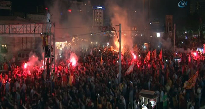 Taksim Meydanı'nda toplanan yüzlerce sarı-kırmızılı taraftar şampiyonluğu doyasıya kutladı. Meşaleler yakıp tezahüratlarda bulunan taraftarlar, şampiyonluk coşkusunu hep beraber yaşadı. Bazı taraftarlar da araçlarıyla şampiyonluk kutlamalarına katılarak konvoy oluşturdu. Kutlamalar esnasında polis ekipleri de çevrede önlemler aldı.
