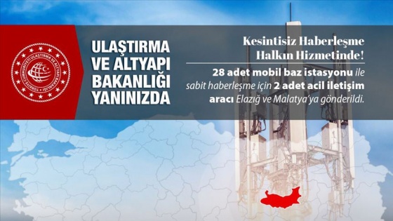 Elazığ ve Malatya'ya 28 mobil baz istasyonu ile 2 acil iletişim aracı ulaştırıldı. 5'i ihtiyaç halinde kullanılmak üzere hazır olarak bekletilen mobil baz istasyonların 23'ü ve acil iletişim araçlarının tamamı devreye alındı.