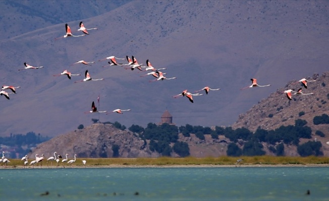Bazı kuş türlerinin Kuzey Afrika'dan İran'a uzanan yolculuğunda en önemli konaklama merkezlerinden olan Van Gölü havzasındaki flamingolar görsel şölen sunuyor.