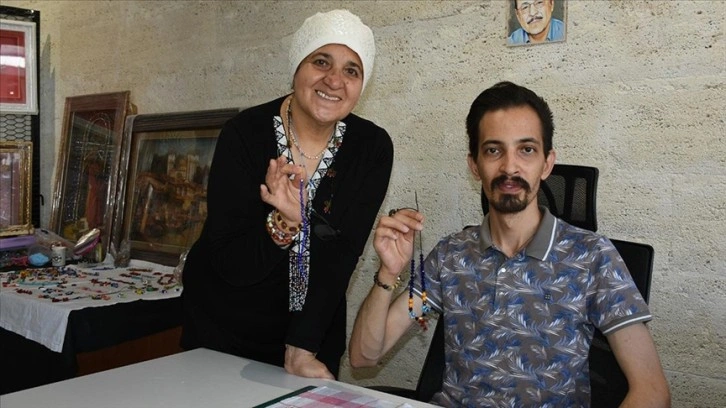Anne oğul, camdan yaptıkları kolye, küpe, bileklik, balık figürleri gibi farklı hediyelik eşya ürünlerini, Ahi Evran Külliyesi'ndeki Zanaatkarlar Çarşısı'nda açtıkları dükkanlarında meraklılarıyla buluşturuyor.