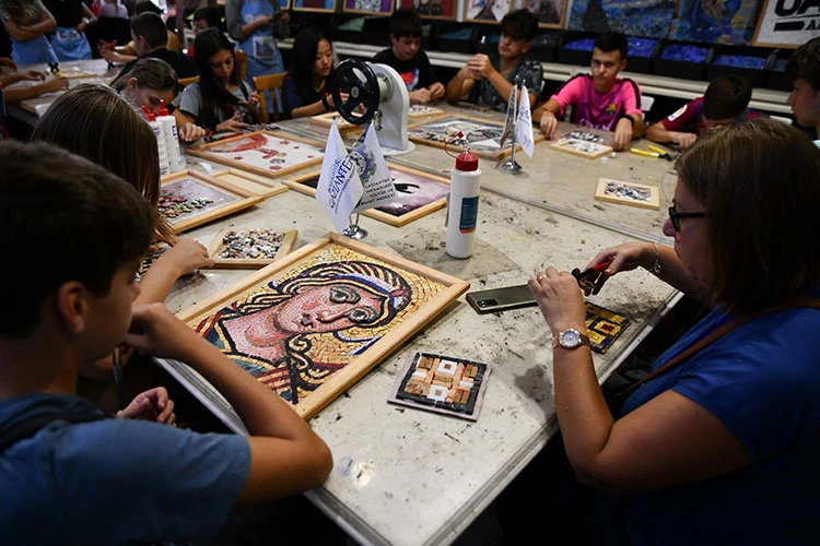 Büyükşehir Belediyesi Jale Tekinalp Yücel Kültür ve Sanat Merkezi'ndeki atölyeye katılan öğrenci ve öğretmenlere mozaik hakkında bilgi verildi.