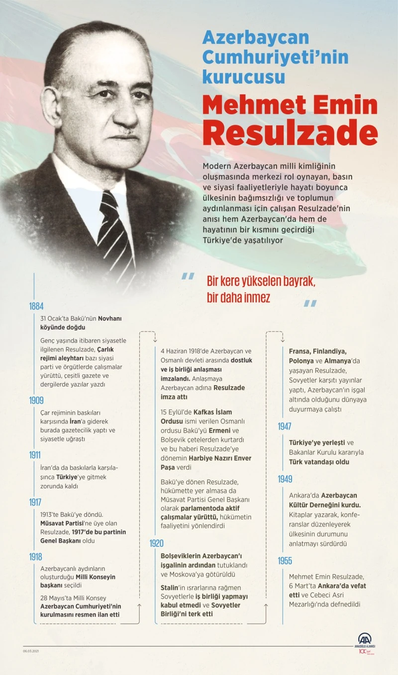 Azerbaycanlılar için bağımsızlığın sembolü olan bir slogan haline gelen "Bir kere yükselen bayrak, bir daha inmez" sözlerinin sahibi Resulzade, 31 Ocak 1884'te Bakü'nün Novhanı köyünde doğdu.