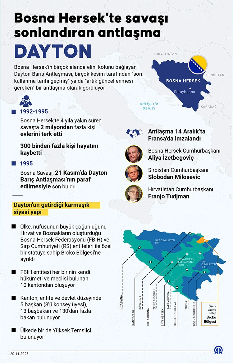 Ülkeye barışı getiren antlaşma, ABD'nin Dayton kentinde 21 Kasım 1995'te paraf edildi ve beraberinde getirdiği karmaşık siyasi yapı nedeniyle Bosna Hersek, 2 entite ve bir özerk bölgeye ayrıldı.