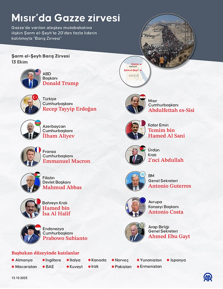 Bu arada, Erdoğan'ın görüştüğü liderler arasında Fransa Cumhurbaşkanı Emmanuel Macron, Mısır Cumhurbaşkanı Abdulfettah es-Sisi, Birleşik Krallık Başbakanı Keir Starmer, İtalya Başbakanı Giorgia Meloni, Almanya Başbakanı Friedrich Merz ve Katar Emiri Şeyh Temim bin Hamed Al Sani yer aldı.