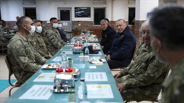 Yemekhaneye girişinde Mehmetçiği selamlayan Cumhurbaşkanı Erdoğan, beraberindeki Milli Savunma Bakanı Akar ve TSK komuta kademesi ile okunan duanın ardından askerlerle birlikte karavanadan yemek yiyerek iftarını yaptı.