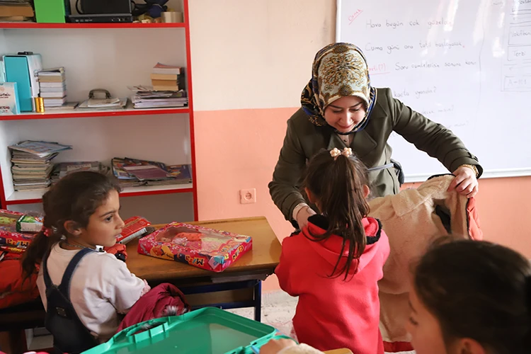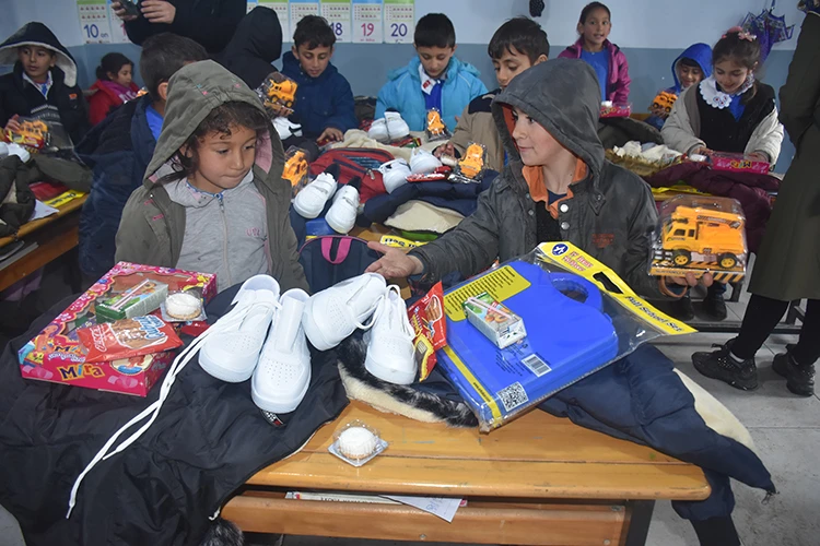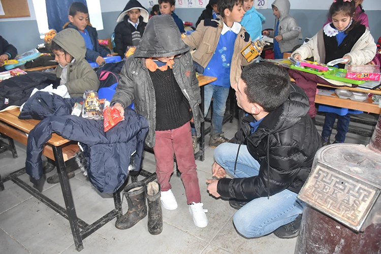 Ekip üyeleri çocuklara oyuncak, bot, mont, kırtasiye malzemesi, şeker, bisküvi ve çikolatadan oluşan bayramlık dağıttı.