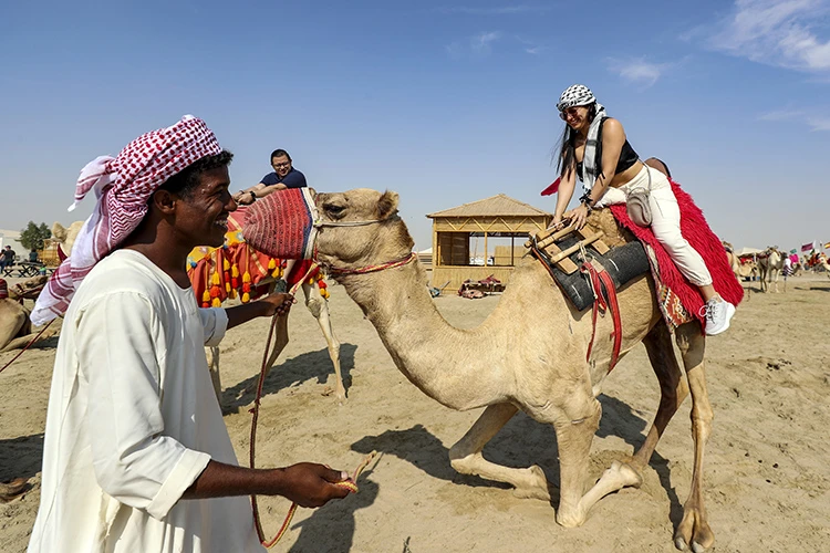Kafalarına kendi ülkelerinin bayraklarını taşıyan guthralar takılan turistler, çölde de develer ile tur atma şansını yakalıyor.