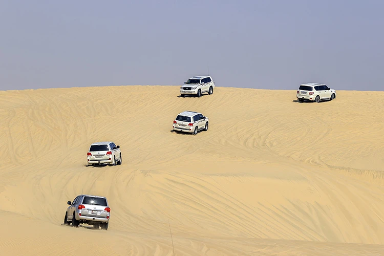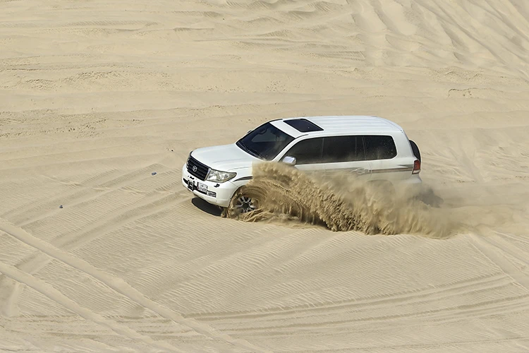 Safari, çölde 8 silindirli 4x4 araçlarla gerçekleştiriliyor. Araçlar, son gaz altın renkli kum tepelerinin arasında ilerleyip, dik yamaçlardan inip çıkıyor.