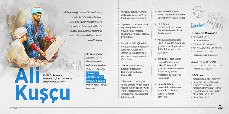Bilime verdiği önemle bilinen Osmanlı Padişahı Fatih Sultan Mehmet tarafından Ayasofya Medresesi'ne müderris olarak tayin edilen, İstanbul'da astronomi ve matematik alanındaki çalışmalara canlılık getiren Türk astronom, matematikçi ve dil bilimci Ali Kuşçu, 548 yıl önce bugün vefat etti.