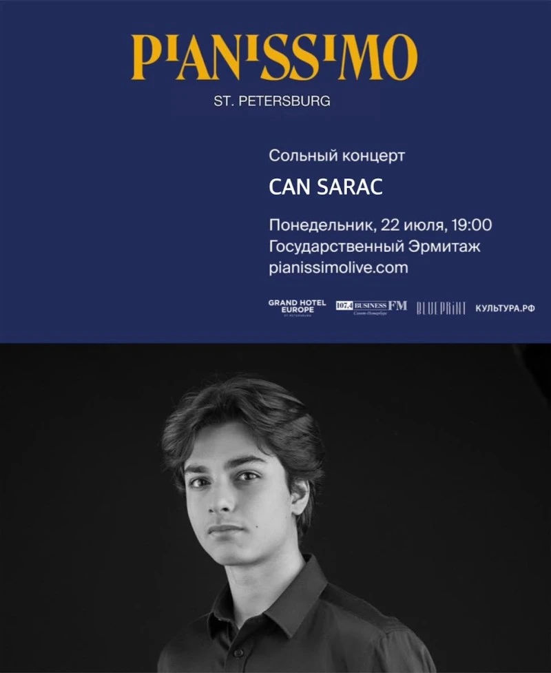 2021 yılından bu yana Münih Müzik ve Sahne Sanatları Üniversitesi’nde Prof. Michael Schäfer’in öğrencisi olarak piyano eğitimine devam eden 16 yaşındaki Türk piyanist Can Saraç, Pianissimo Summer Festivali kapsamında Rusya’nın üç şehrinde solo piyano resitali verecek.