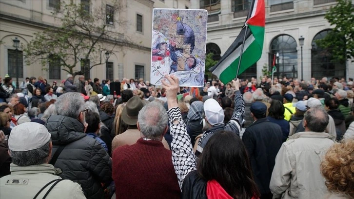 Reina Sofia Müzesi önündeki meydanda toplanan, aralarında sanatçılar ve aydınların da bulunduğu kalabalık, "İsrail'in kendisini savunma ve güvenliğini koruma hakkının olmasına rağmen bunun hiçbir zaman Gazzelilere yapılan soykırımı haklı çıkarmayacağı" mesajını verdi.