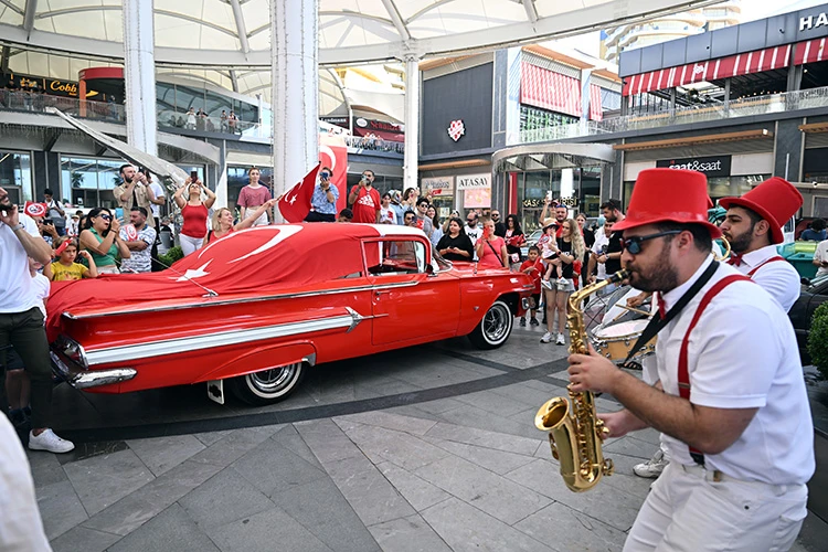 Pendik'te bir AVM önünde duran konvoydakiler bando eşliğinde marşlar söyledi.