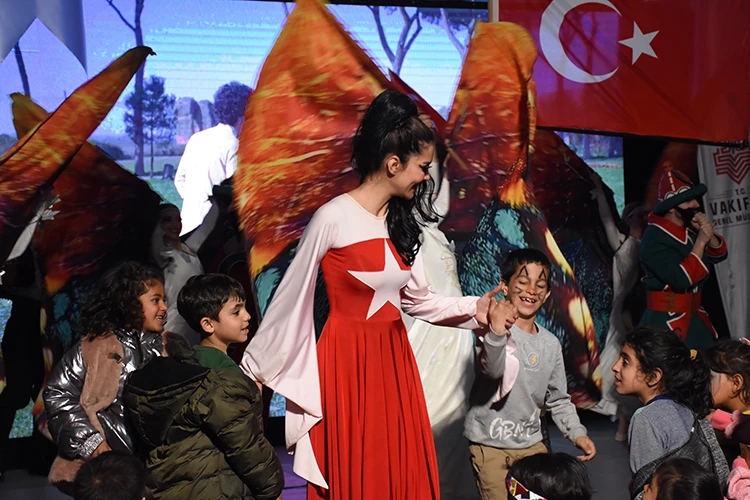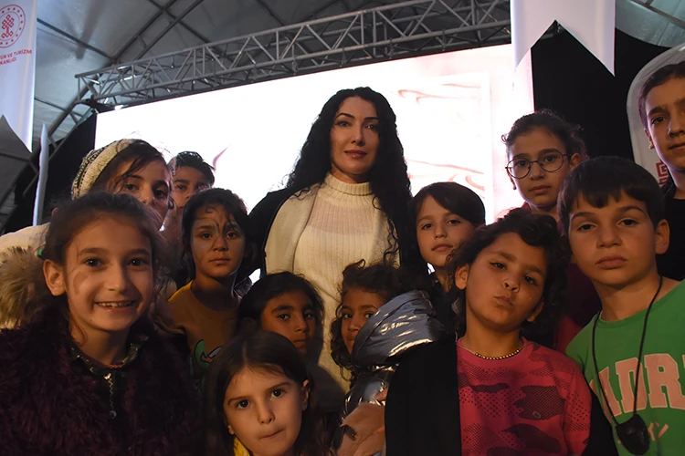 Oyunun ardından sahneye çıkan depremzede çocuklar, gösteri sunan sanatçılarla birlikte dakikalarca eğlenip dans etti.