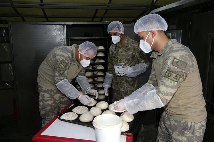 Mehmetçik, seyyar sahra fırınında günlük 1500 sıcak ekmek ve pide üretiyor. İftar saatinde vatandaşlara ailedeki birey sayısına göre ekmek dağıtılıyor.