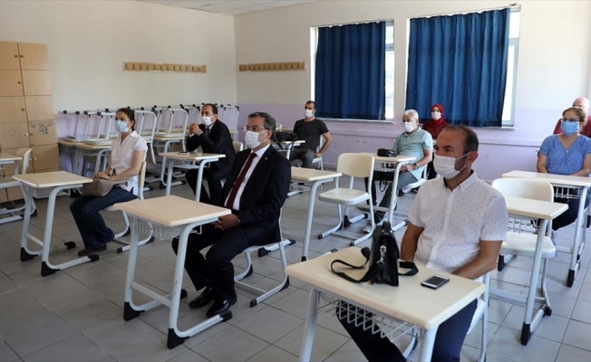 Öğretmenler okulun toplantı salonunda Milli Eğitim Bakanı Ziya Selçuk'un konuşmasının ardından salgına karşı koruyucu ve önleyici tedbirler ile okulda uyulması gereken kurallar hakkında bilgilendirildi.