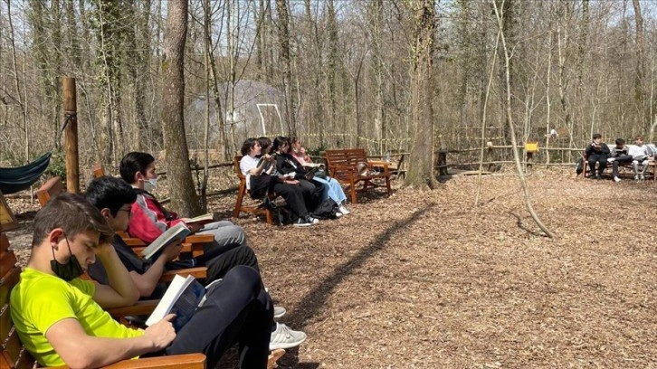 Kocaeli'nin Kartepe ilçesinde yaklaşık 2 bin dönümlük alana kurulu Ormanya'da açılan "Orman Kütüphanesi"nde ziyaretçiler, açık havada kuş sesleri arasında kitap okumanın keyfini yaşıyor.