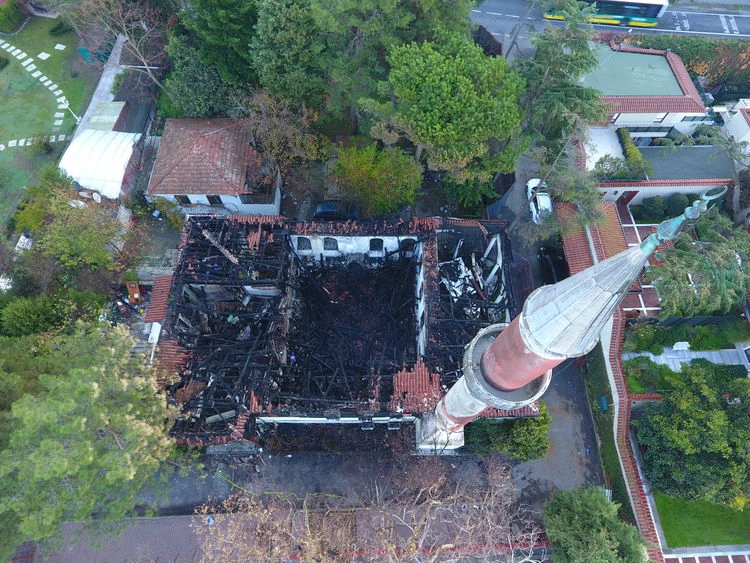 Cami ve bitişiğindeki hünkar kasrı ile avluda bulunan müştemilat, şadırvan ve parsel duvarlarındaki restorasyon ve onarım çalışmaları süren camide yangının bıraktığı izler siliniyor.