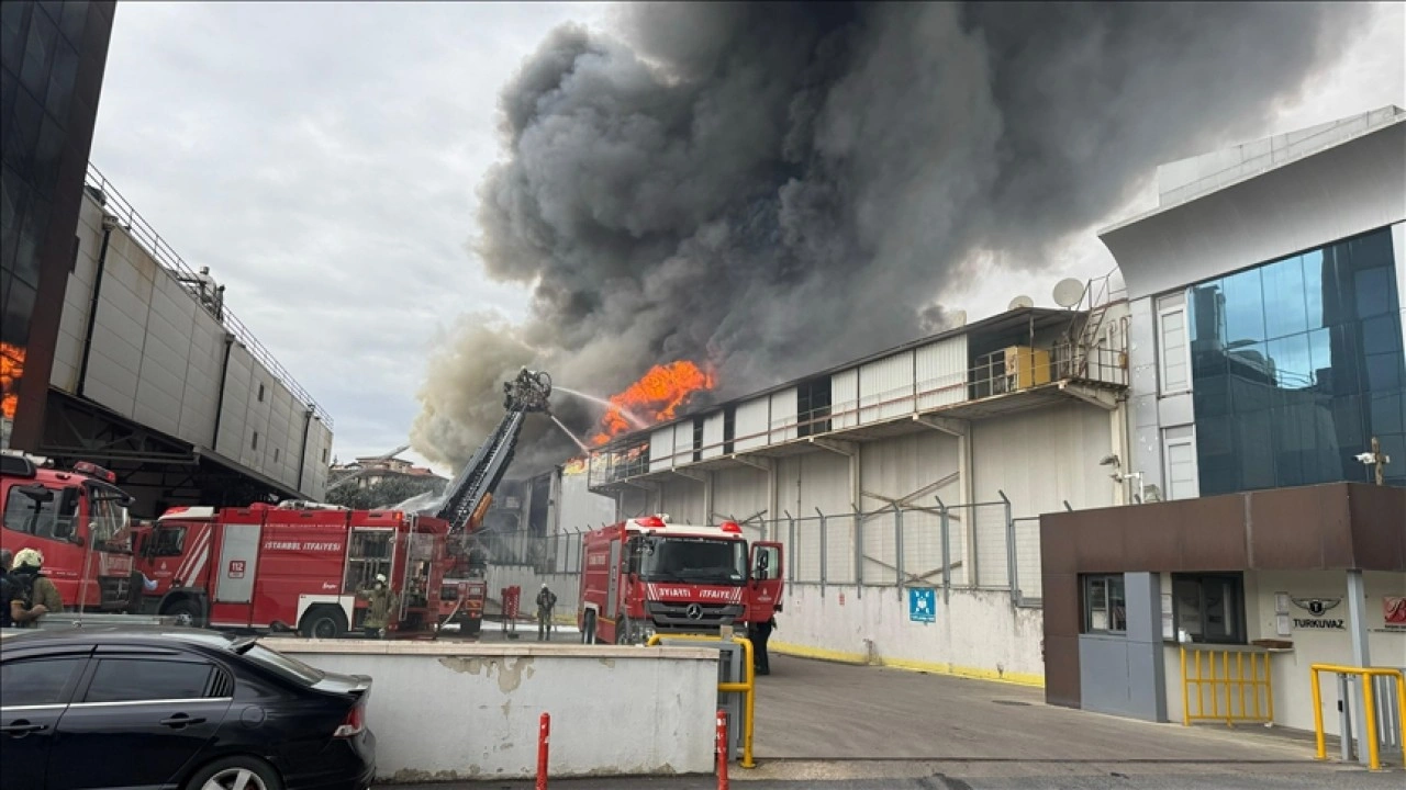 İstanbul Sancaktepe'de bir iş yerinde çıkan yangın itfaiye ekiplerince söndürülmeye çalışılıyor
