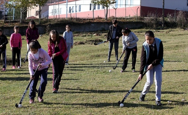 Bolu merkeze bağlı Çobankaya köyünde eğitim gören ilkokul ve orta okul öğrencileri, okul yakınlarındaki boş bir arsada antrenör eşliğinde çim hokeyi öğreniyor.