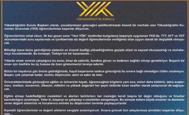Paylaşımda, Yükseköğretim Kurulu Başkanı olarak, çocukların geleceğini şekillendirmede önemli bir merhale olan Yükseköğretim Kurumları Sınavında (YKS) öğrencilere başarılar dilediğini belirten Saraç, “Öğrencilerimiz rahat olsun, ilk kez geçen sene ‘Yeni YÖK’ tarafından kurgulanıp başarıyla uygulanan YKS’de, TYT, AYT ve YDT oturumlarındaki soru sayılarında ve içeriklerinde siz değerli öğrencilerimize verdiğimiz söze uygun olarak bir değişiklik olmayacak” dedi.
