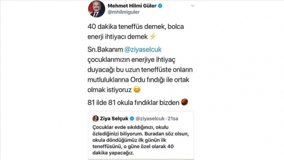 Ordu Büyükşehir Belediye Başkanı Mehmet Hilmi Güler, Twitter'da, Milli Eğitim Bakanı Ziya Selçuk'un "Çocuklar evde sıkıldığınızı, okulu özlediğinizi biliyorum. Buradan söz olsun, okula döndüğümüz ilk günün ilk teneffüsünü, o güne özel olarak 40 dakika yapacağız." açıklamasına yanıt verdi.