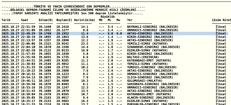 AFAD, saat 22.48'de merkez üssü Balıkesir'in Sındırgı ilçesi olan 6,1 büyüklüğünde deprem meydana geldiğini bildirdi. Balıkesir'in Sındırgı ilçesinde saat 22.48'de 6,1 büyüklüğünde deprem meydana geldi. Sındırgı Kaymakamı Koyuncu, birkaç noktada yıkım olduğunu, şu ana kadar can kaybı tespit etmediklerini ve bölgede tarama faaliyetlerinin sürdüğünü söyledi