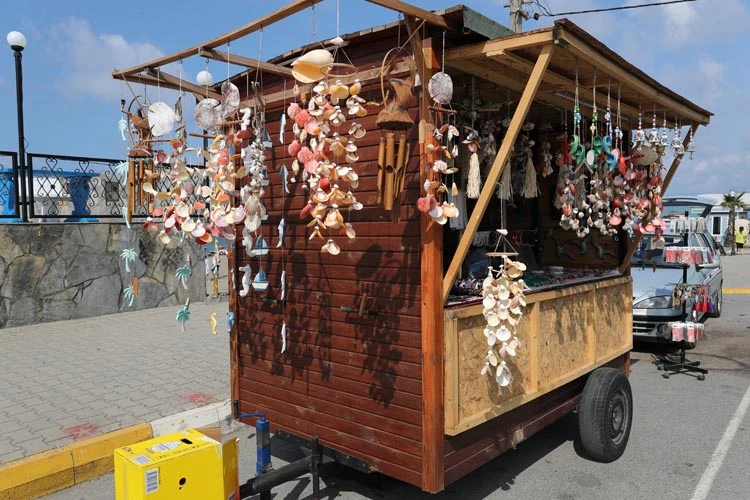 Sahilden topladığı deniz kabuklarından süs eşyası üreten, ahşap malzemeleri çeşitli hediyelik ürünlere dönüştüren Deniz, bunları seyyar tezgahında satıyor.
