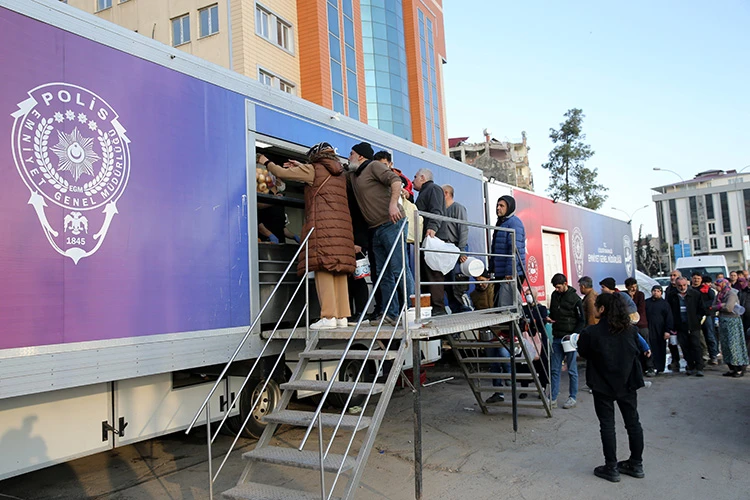 Emniyet Genel Müdürlüğü Sosyal Hizmetler ve Sağlık Daire Başkanlığı koordinasyonunda depremin ilk gününden itibaren tırlardan depremzedelere sıcak yemek dağıtımı yapılıyor.