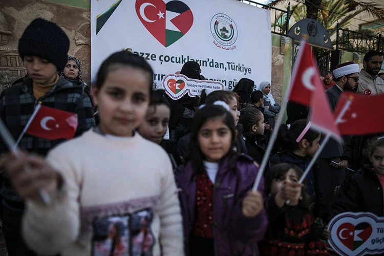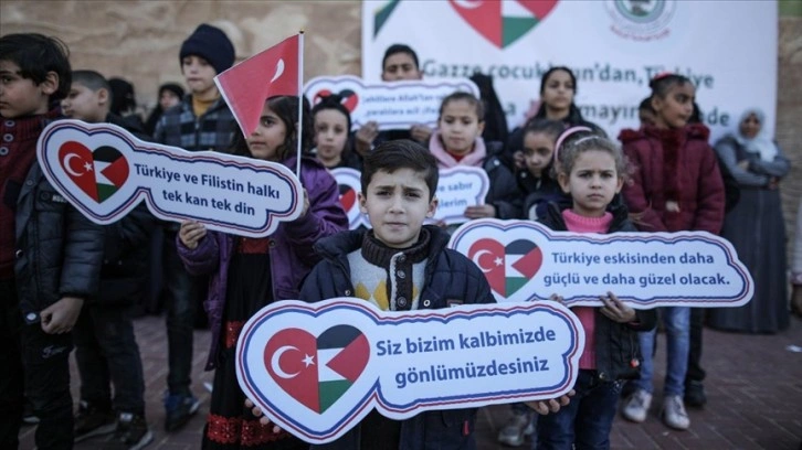 Gazze'deki Filistinli çocuklar ve aileleri, Kahramanmaraş merkezli depremlerden zarar gören Türkiye ve Suriye'deki afetzedelerle dayanışma gösterisi düzenledi