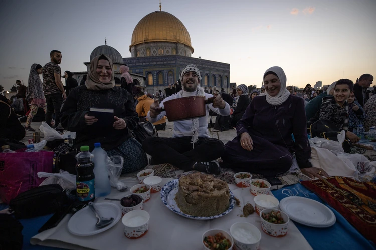 Mescid-i Aksa’daki altın rengi kubbesiyle dikkati çeken Kubbet'üs Sahra’nın çevresindeki Filistinli aileler, evde hazırladıkları maklube tencerelerini akşam ezanının okunmasıyla birlikte ters çeviriyor.