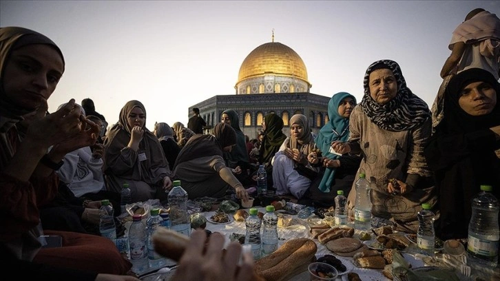 Mescid-i Aksa’daki Kıble Mescidi’nin içi ve çevresi toplu iftarlar için ayrılırken, kutsal mabedin avlu ve bahçeleri ise Filistinli ailelerin ve yabancı misafirlerin iftar sofralarıyla dolup taşıyor.