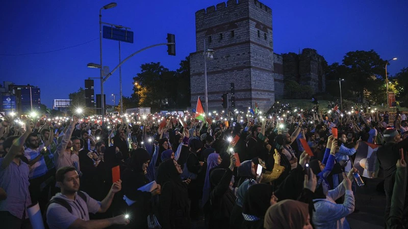 Yürüyüşte, Mavi Marmara şehitlerinin isimleri okundu, katılımcılar "burada" yanıtını verdi.