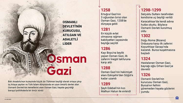Gerçekleştirdiği fetihlerle Türk-İslam medeniyetinin dünyaya yayılmasında atılan adımlarda öncü olan Osman Gazi, Osmanlı Devleti'nin kuruluşunda etkin rol aldı.
